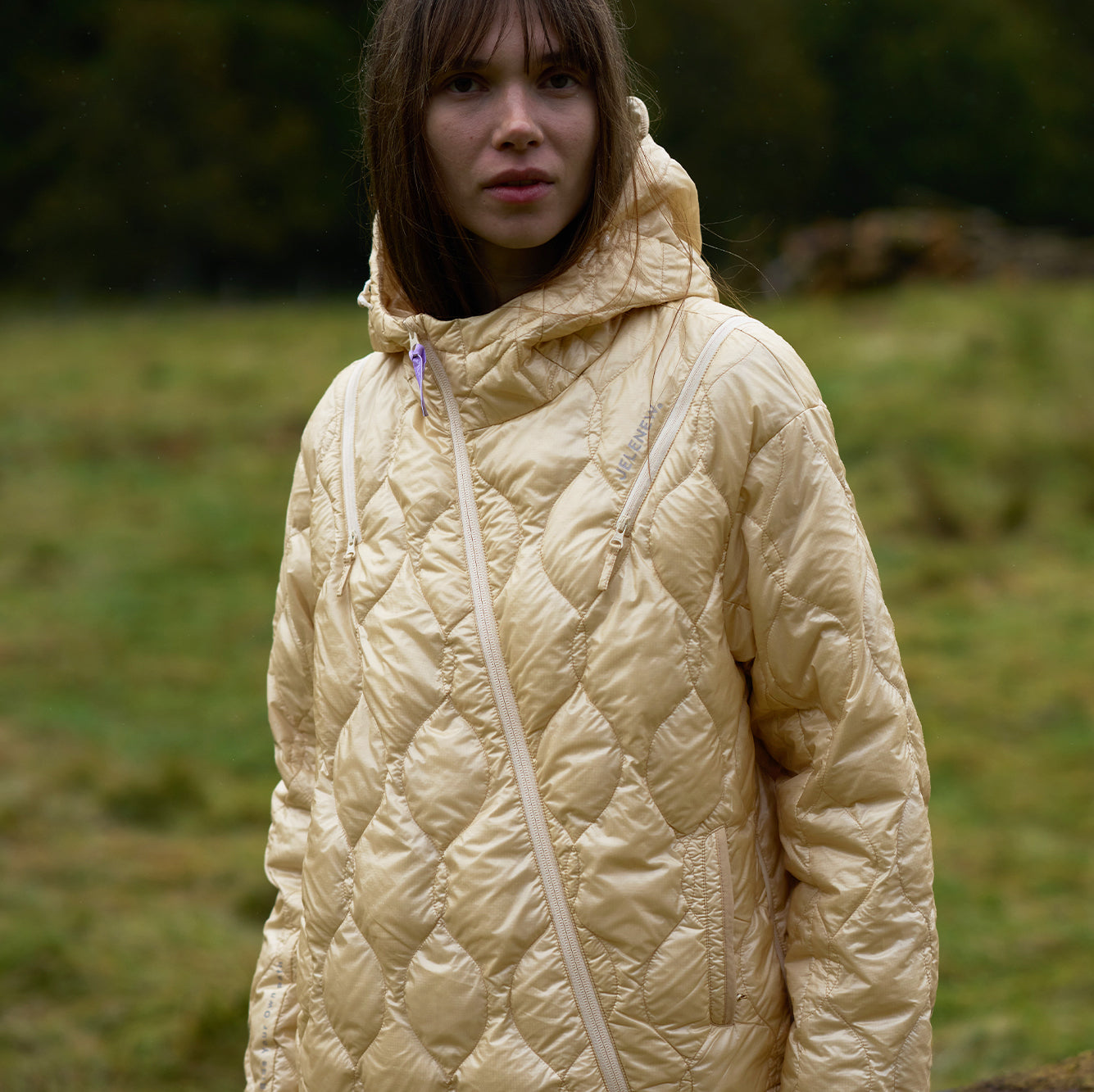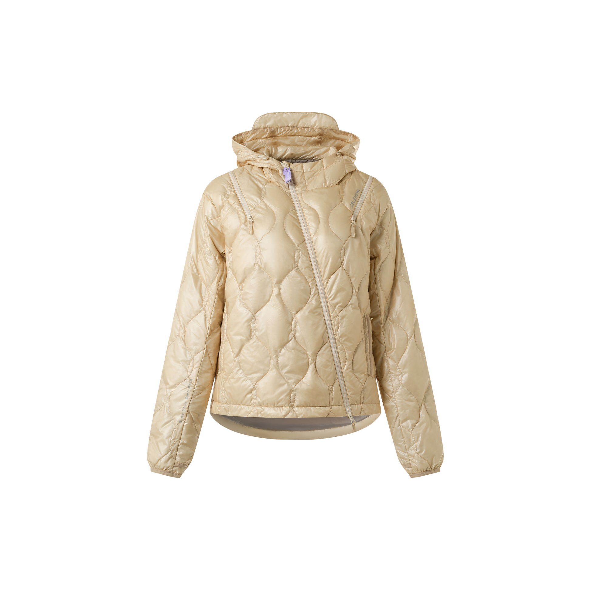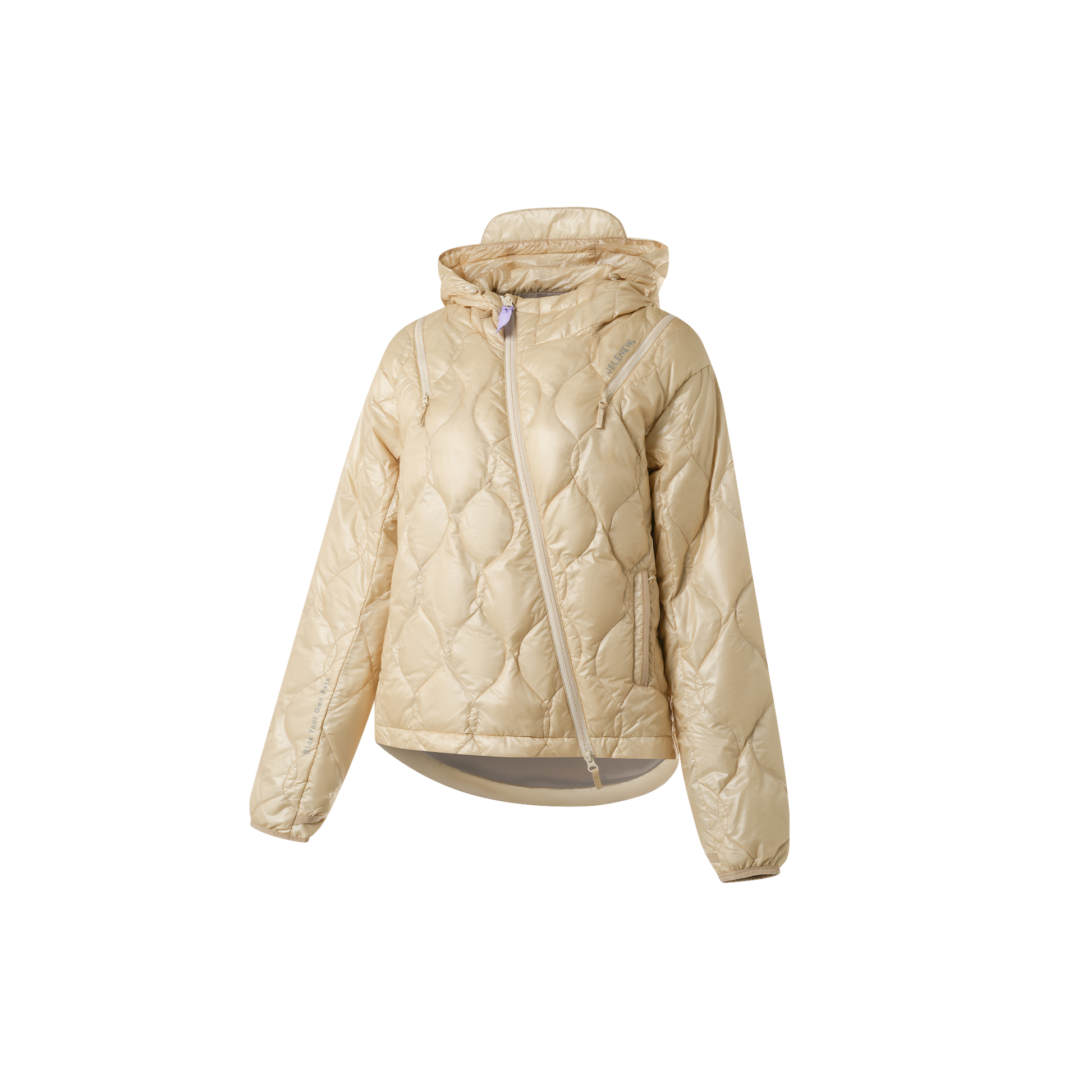 Engineered with a modern deconstructed aesthetic, this down jacket features a distinctive diagonal zipper and a versatile hooded liner that can be worn as either an inner or outer layer. The cycling-friendly cut makes it suitable for both rides and light outdoor activities.